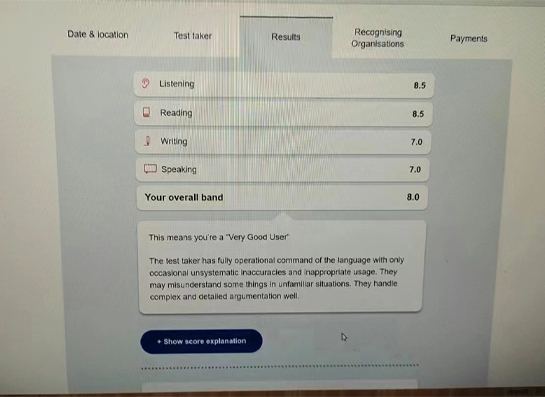 恭喜D同学成功出分啦,口语从6.0提高到了7.0,听力从7.5提高到了8.5,总分也提高到了8.0!